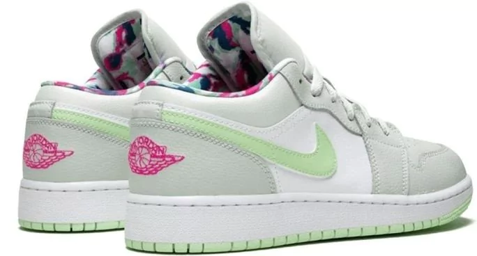 Refazendo o sapato adulto original Peter Moore de 1985 em cores atualizadas, o Air Jordan 1 Low GS 'Barely Grey Spruce' foi lançado em março de 2019 para acentuar a linha de primavera AJ. O clássico arco de corte baixo ostenta uma base branca destacada por um Swoosh verde-menta e sucessos multicoloridos que definem o acabamento da gola, laçada de renda e lingueta reversa. Os elementos de suporte do original permanecem intactos, incluindo o painel do calcanhar estabilizador e as sobreposições nos olhos, no meio do pé e no guarda-lamas.