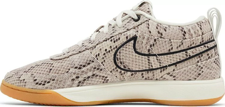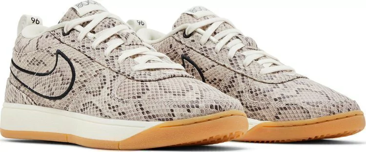 O Nike Book 1 'Python' apresenta um padrão de pele de cobra em todo o cabedal de couro, acentuado com um Swoosh exclusivo delineado em bordado preto. 'Book' está inscrito na etiqueta da língua tecida, enquanto uma aba de puxar no calcanhar é marcada com 'Chapter One' e '96' — uma referência ao ano de nascimento de Devin Booker. O tênis fica sobre uma entressola de espuma Cushlon 2.0, apresentando uma parede lateral rígida de TPU e uma unidade Zoom Air de carga superior no calcanhar.