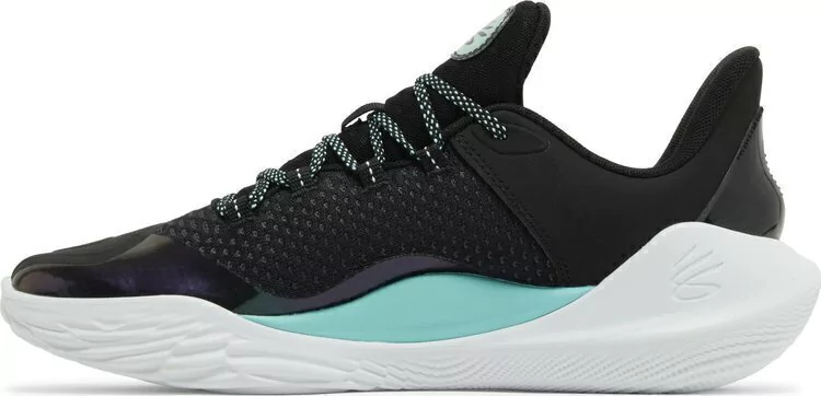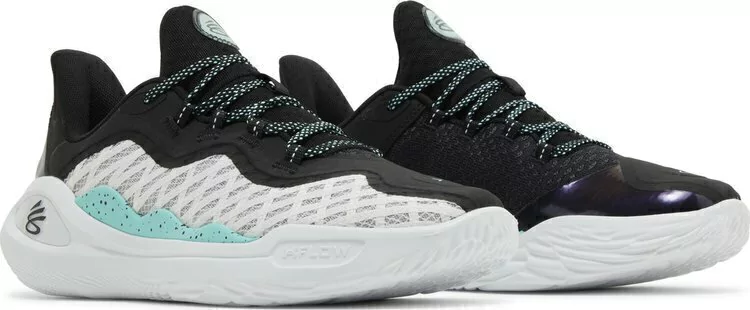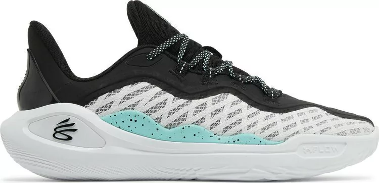 O Curry Flow 11 'Future Curry' representa a estreia do 11º sapato exclusivo de Stephen Curry. A parte superior apresenta UA IntelliKnit preto com sobreposições tonais sem costura e construção UA Warp branca na lateral. Um contraforte externo em TPU moldado em 3D proporciona estabilidade no retropé. A configuração de amortecimento assume a forma de uma sola UA Flow de dupla densidade, que elimina a sola de borracha tradicional para reduzir o peso. Uma haste interna no meio do pé oferece suporte aprimorado ao arco.