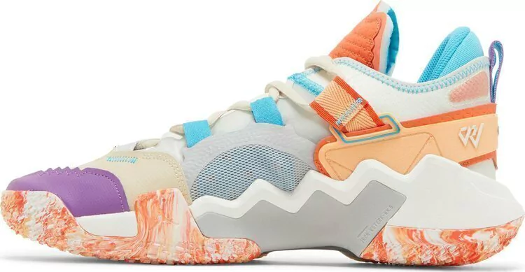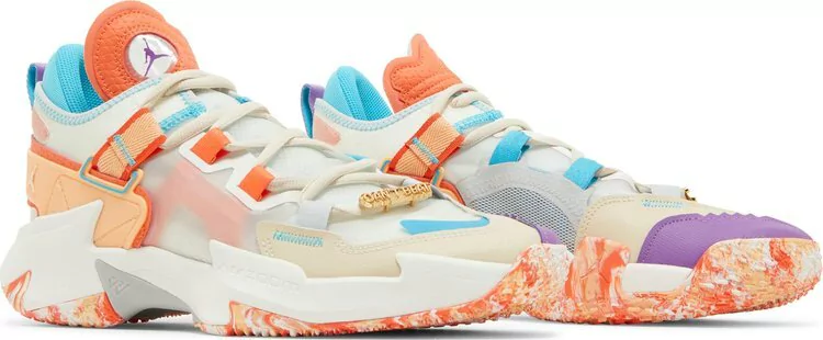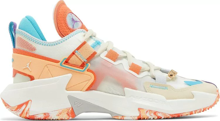 Os detalhes de destaque incluem correias douradas "CAN'T BEAT/THAT PRICE", marca Jordan e Westbrook na língua e no calcanhar e uma palmilha gráfica "WHY NOT"/"129.99". Uma entressola branca e uma sola de borracha marmorizada laranja/vermelha/branca completam o visual deste Jordan Why Not.