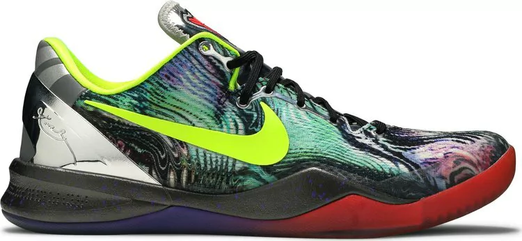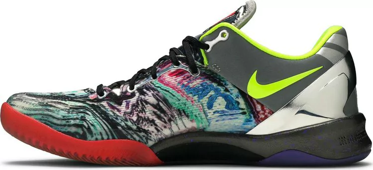 A parte superior da malha projetada do Nike Kobe 8 System 'Prelude' apresenta redemoinhos abstratos inspirados na arte contemporânea. O acabamento espelhado no calcanhar moldado simboliza o período de reflexão de Bryant após uma temporada 2012-2013 marcada por lesões. O design exclusivo termina com um Volt vibrante no Swoosh e detalhes em gradiente vermelho e roxo na sola.