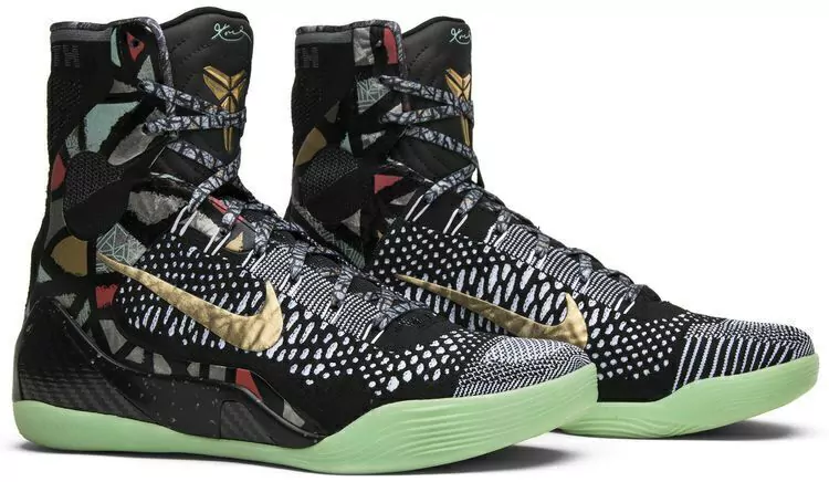 Parte da coleção NBA All-Star de 2014, o Kobe 9 Elite 'NOLA Gumbo League - Maestro' é construído com um cabedal Flyknit preto e branco contrastado com detalhes dourados no Swoosh e na marca, enquanto uma miríade de motivos inspirados em Nova Orleans podem ser vistos no calcanhar e na palmilha. O tênis é finalizado com um solado verde neon que não passará despercebido, graças a uma sobreposição que brilha no escuro.