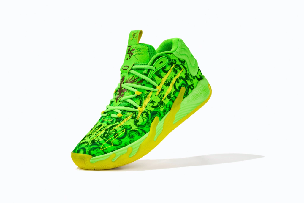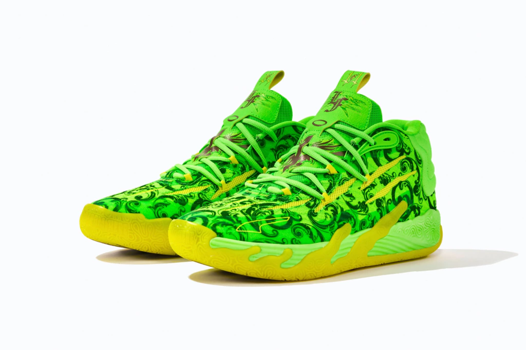 Extraído de uma coleção cápsula da marca de estilo de vida LaMelo Ball, o LaFrancé x PUMA MB.03 'FOREVER.RARE' apresenta uma parte superior em malha verde brilhante, coberta por uma estampa de flor de lis e acentuada com marcas de garras alienígenas. 'LF' está estampado na língua, enquanto o painel acolchoado do calcanhar em tecido exibe as marcas 'M.E.L.O.' e '01 of One'. Sob os pés, 'RARE' está escrito na sola de borracha translúcida, que se estende pela entressola NITROFOAM para um efeito único de banho ácido.
