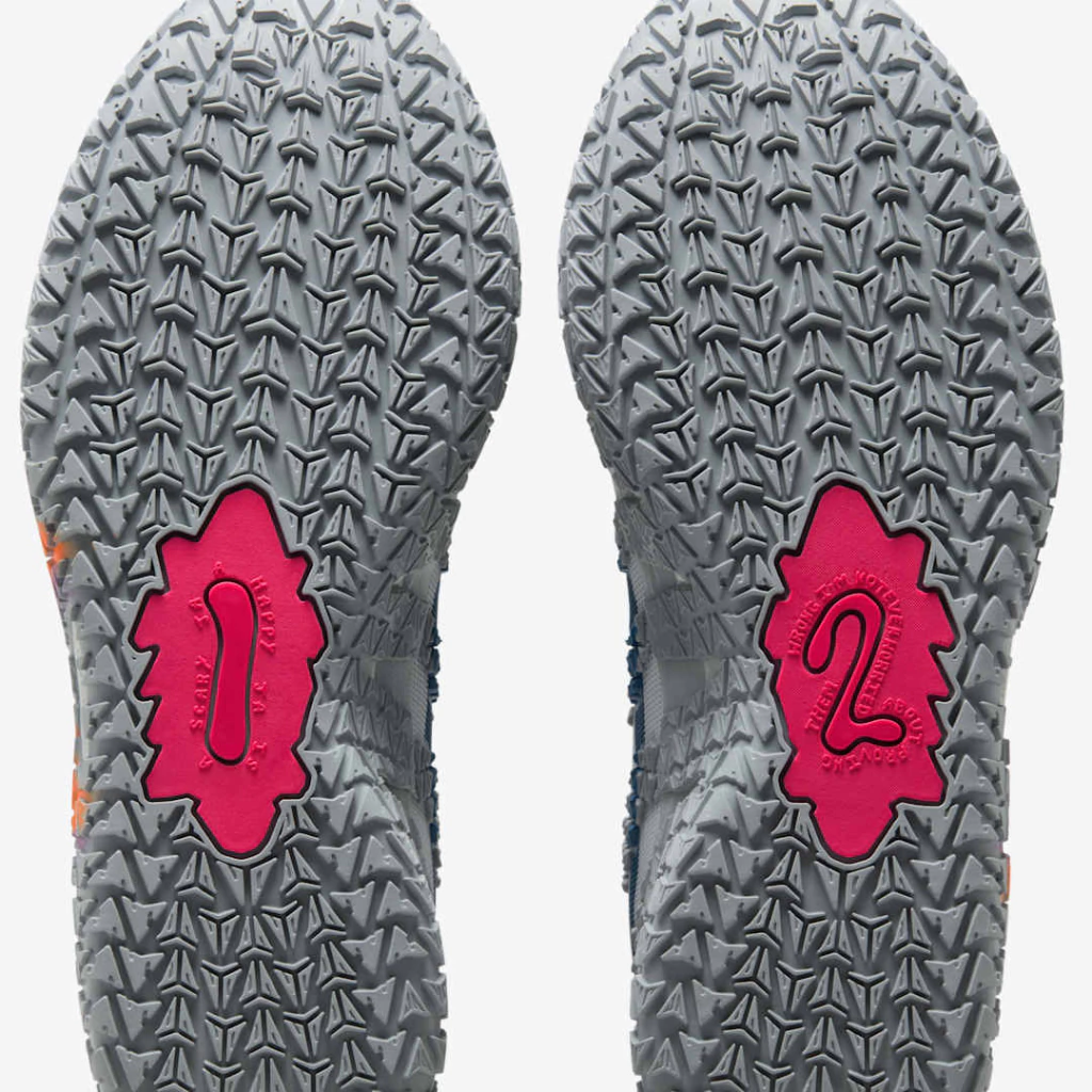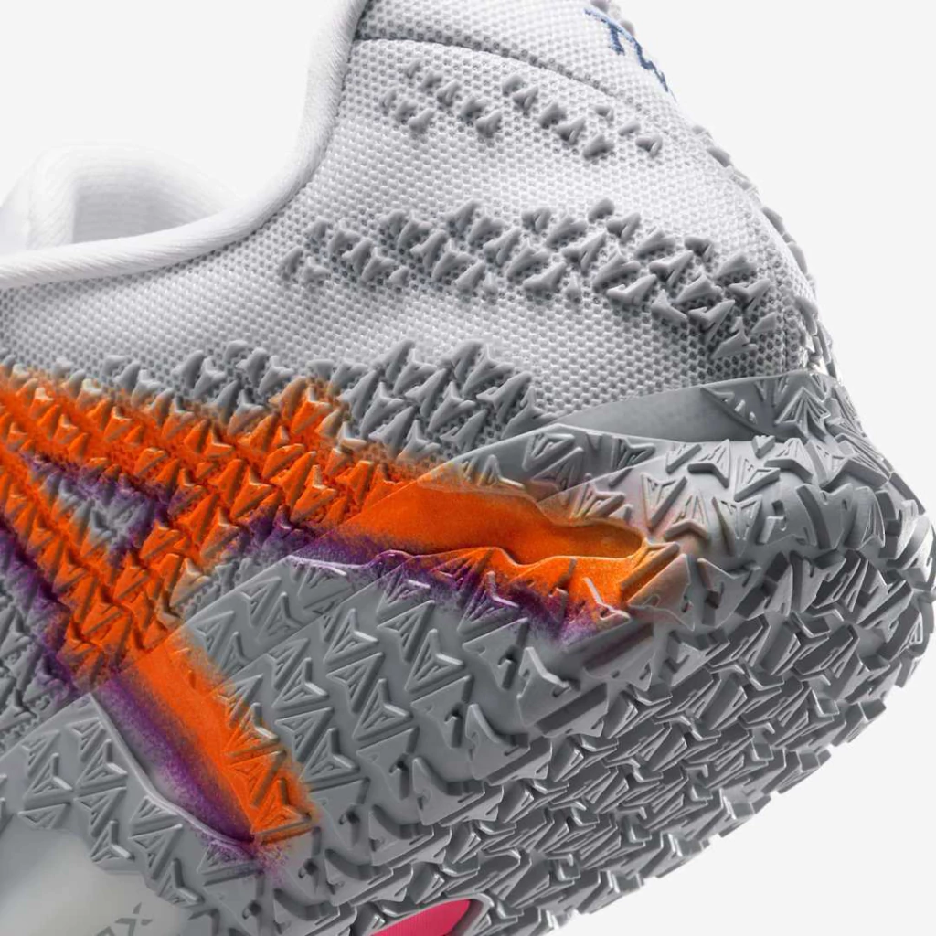 O Nike Ja 3 "Light Show" utiliza um cabedal em mesh cinza claro, revestido por sobreposições com padrão riscado que apresentam o logotipo de Ja Morant em relevo em uma estampa de monograma. No painel lateral, um Swoosh azul vertical com detalhes em fúcsia é ladeado por um "A" oversized em estilo grafite em um tom vermelho vivo. O amortecimento leve e responsivo chega através de uma entressola de espuma ZoomX em toda a extensão do pé. Sob os pés, o solado de borracha cinza é revestido por mini logotipos Ja adicionais para aderência multidirecional.