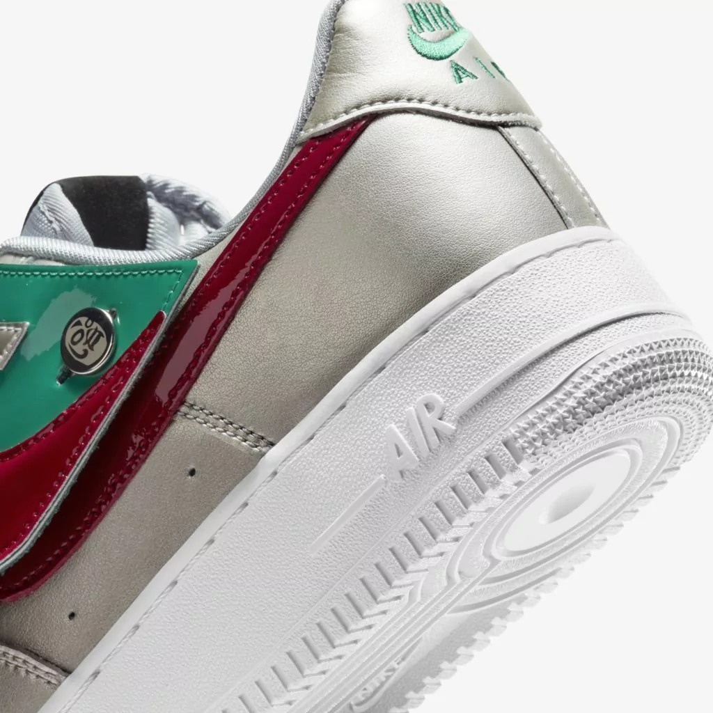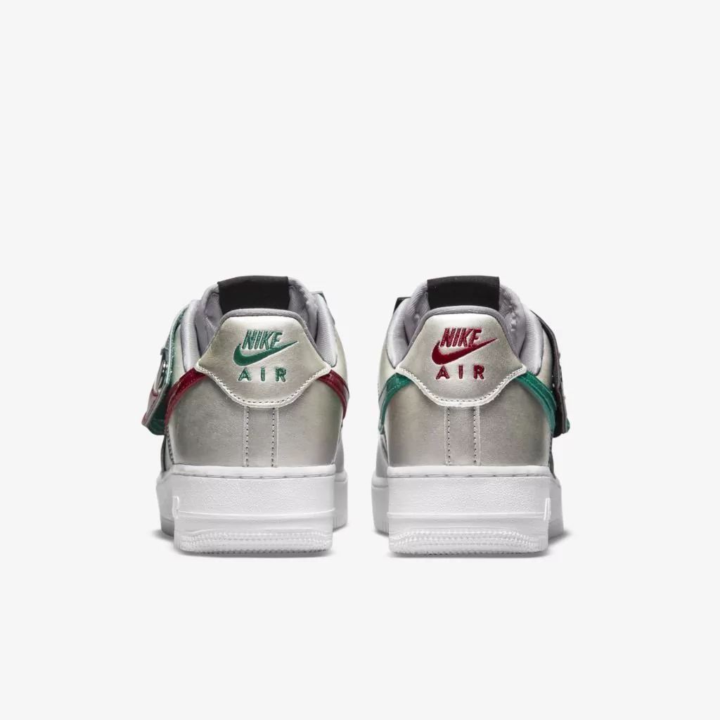 O Nike Air Force 1 '07 LV8 'Lucha Libre' atualiza a silhueta clássica com detalhes únicos inspirados no wrestling mexicano. Uma parte superior de couro prateado metálico é acentuada com as cores da bandeira mexicana - um Swoosh de couro vermelho adorna o lado lateral, enquanto o lado medial apresenta um Swoosh de couro verde. Os mesmos tons são aplicados ao bordado Nike Air incompatível na aba do calcanhar. Integrada nos cadarços, uma máscara de luchador removível é sobreposta na língua. Um cupsole de borracha branca sólida com amortecimento Air-sole encapsulado ancora o cano baixo.