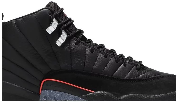 O Air Jordan 12 Utility 'Grind' oferece uma visão renovada da silhueta legada que introduziu o amortecimento Zoom Air na franquia Jordan. Salpicos sutis são aplicados à sola intermediária de borracha, indicando uma composição mista que inclui pelo menos 3% de Nike Grind. A parte superior é construída em couro preto com camadas de camurça preta combinando. A textura característica do lagarto do 12 é relegada à entressola Phylon. A malha preta balística é utilizada na língua, com um ícone tonal do Jumpman delineado em vermelho.