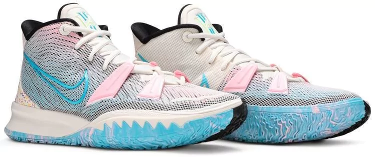 O Nike Kyrie 7 EP 'Pale Ivory' traz uma parte superior em malha esbranquiçada que revela cores pastéis ondulantes no revestimento têxtil. Um Swoosh em relevo em rosa e preto adorna o lado lateral, enquanto um Swoosh azul impresso decora o lado oposto. Um design dividido é usado de forma semelhante na sola de borracha e na sobreposição do calcanhar, apresentando equações e gráficos de um lado e rabiscos coloridos do outro. Na frente de desempenho, o tênis anda em uma entressola Phylon leve com uma unidade Air Zoom Turbo no antepé. Esta edição EP apresenta uma sola de borracha resistente projetada para quadras ao ar livre.