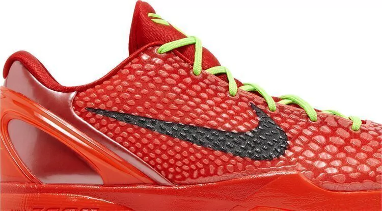 O Nike Zoom Kobe 6 Protro 'Reverse Grinch' oferece uma versão colorida do icônico colorway 'Grinch' de 2010. Um tom carmesim brilhante é executado na parte superior escamosa de micro-malha, presa com cadarços verdes neon e acentuada com um contraste Swoosh preto. Uma gola acolchoada de corte baixo permite uma amplitude completa de movimentos, enquanto um calcanhar moldado em TPU proporciona estabilidade no retropé. O tênis assenta em uma entressola Cushlon leve com uma unidade Zoom Air elástica aninhada no antepé.